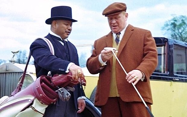 Goldfinger is aided by his caddy/manservant, Oddjob. Not only does the mute Oddjob later take the head off a statue with his bowler, and crushes a golf ball in the palm of his hand, but he caddies in what is best described as a mashed-up morning suit, leather shoes and said hat.